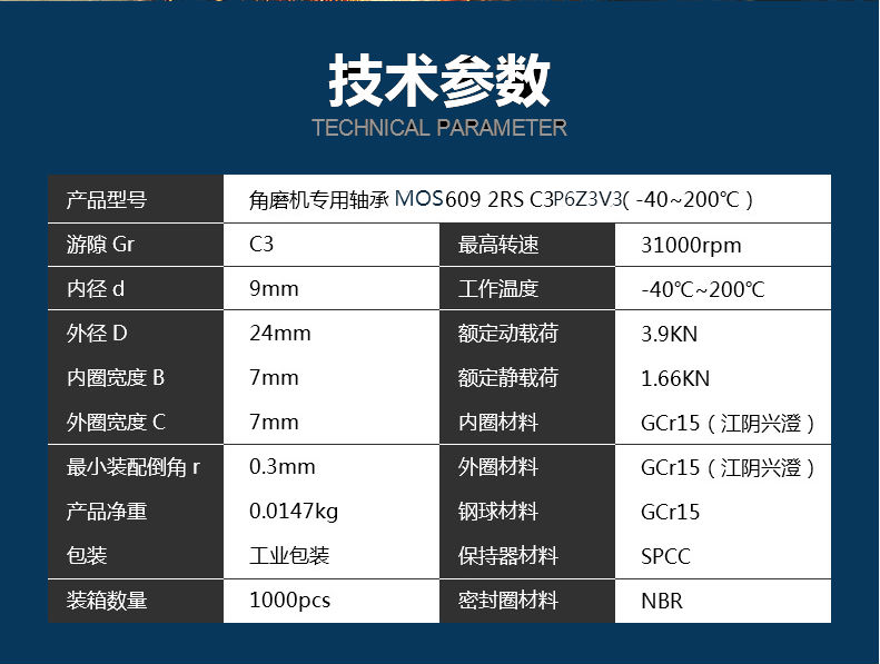 角磨机专用轴承 SHW 609 2RS 标准等级 C3 P6Z3V3 -40℃~+200 ℃