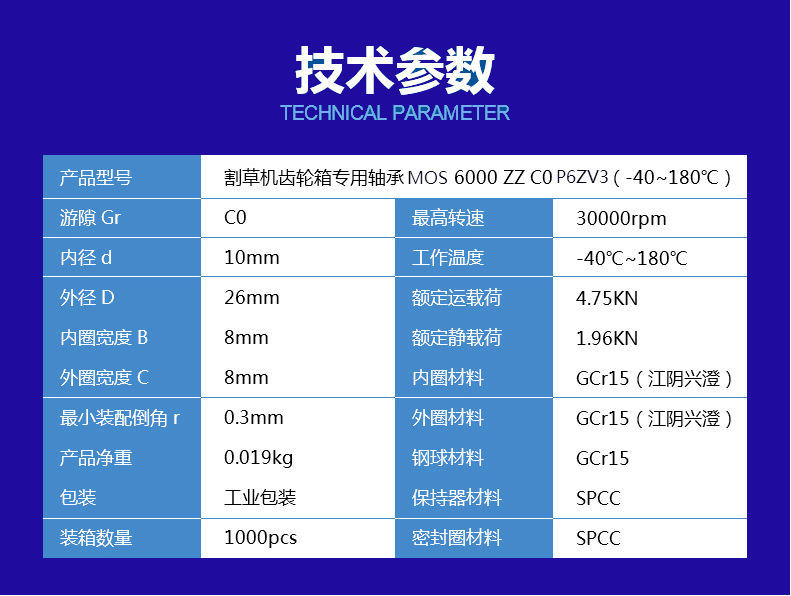 割草机齿轮箱专用轴承SHW 6000 ZZ C0标准等级P6Z3V3(-40~180℃)